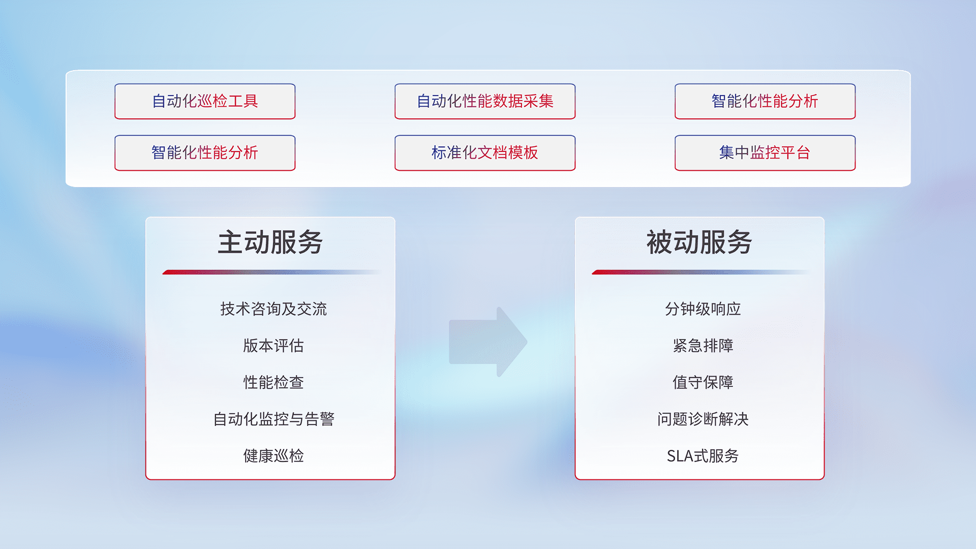 智能化工具和标准化文档,,,保障服务质量,,,提供主动服务(包含技术咨询、、、版本评估、、、性能检查、、、、自动化监控与告警、、健康巡检)和被动服务包含(分钟级响应、、、、紧急排障、、、值守保障、、、问题诊断解决、、、、SLA服务)。。
